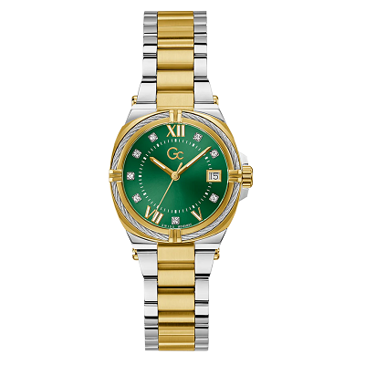With its unique cable-wire on the top ring - the Gc IronClass and its 32mm cushion case shows a mix of coolness and sophistication. This silver and yellow gold two-tone version hosts an emerald green sunray dial with crystal indices as a testimony of elegance.