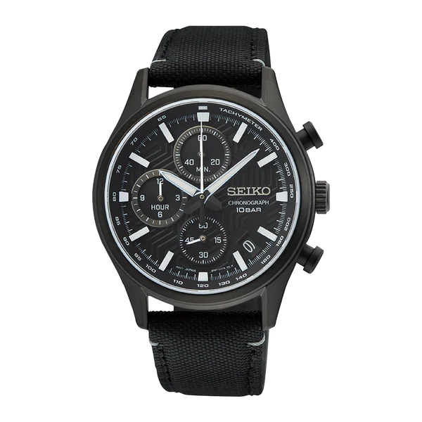 Black stainless steel case with a black leather strap. Fixed black stainless steel bezel. Black dial with silver-tone hands and index hour markers. Minute markers around the outer rim. Dial Type: Analog. Luminescent hands and markers. Between the 4 and 5 o'clock position. Chronograph - three sub-dials displaying: 60 second, 60 minute and 12 hour. Seiko Caliber 8T67 quartz movement. Scratch resistant sapphire crystal. Pull / push crown. Solid case back. Round case shape, case size: 39.5 mm, case thickness: 11.55 mm. Band width: 20 mm. Tang clasp. Water resistant at 100 meters / 330 feet. Functions: chronograph, date, hour, minute, second. Chronograph Series. Sport watch style. Watch label: Japan Movt. Seiko Chronograph Quartz Black Dial Men's Watch SSB421P1.