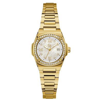 The Gc Coussin Shape Mini, with its 30mm cushion case, crystals on the top ring and H-link bracelet is an alluring timepiece. This yellow gold PVD version has beautiful eco-friendly white mother-of-pearl dial