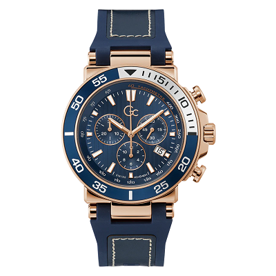 The iconic Gc One Sport Chronograph with an elevated design and attention to details with a 44mm rose gold PVD case and bicolor aluminium top ring, blue dial and silicone flex strap dressed up with a refined layer of eco-friendy leather on top.