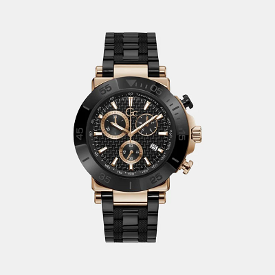 Impose yourself with this oversize modern take on the most iconic Gc chronograph, its brushed and polished rose gold tone case equipped with a black etched bezel, genuine carbon fiber dial with tachymeter and three sub-counters, and black metal bracelet with deployment buckle.