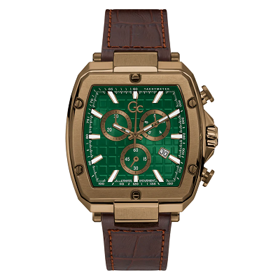 Square the circle with this bronze tonneau chronograph. This style is highly detailed thanks to a green square pattern dial set off by bronze accents, a bronze PVD bezel with recognizable screw design details, on a croco-patterned brown leather-coated silicone strap for maximum comfort.