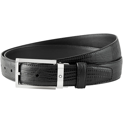 Rectangular pin buckle belt in polished stainless steel. Adjustable strap of 3 cm x 120 cm in black leather with lizard print. An elegant belt for the office, with a touch of rare refinement.