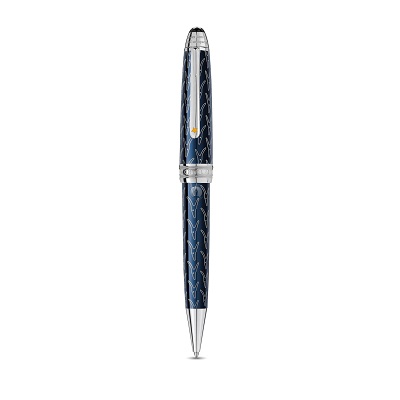 Montblanc Meisterstuck Le Petit Prince Solitaire Midsize ballpoint pen in deep blue lacquer with a fox face pattern and a clip with yellow lacquered star.