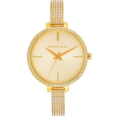 | This Michael Kors Jaryn watch features a minimalist gold sunray dial, a pavé-embellished case and allover pavé half-bangle bracelet. |