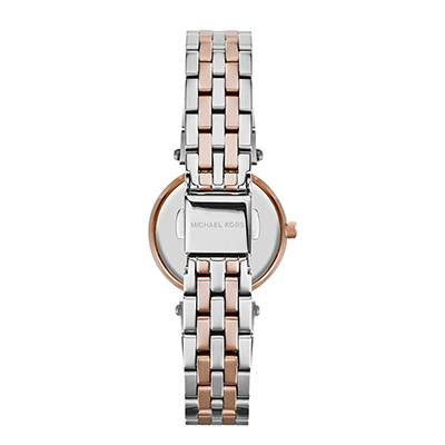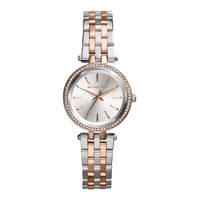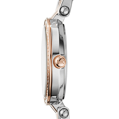 Stainless steel case with a two-tone (silver and rose gold tone) stainless steel bracelet. Fixed rose gold tone bezel set with crystals. Silver dial with rose gold tone hands and index hour markers. Round case shape. Water resistant to 50 meters.