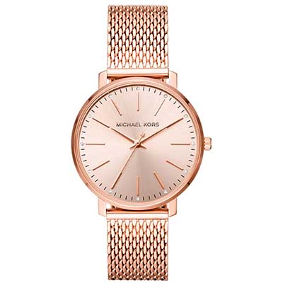 | This 38mm Pyper watch features a rose gold sunray dial and stick indexes, three-hand movement and rose gold-tone stainless steel mesh bracelet. |