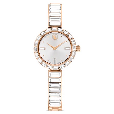 Elegance is amplified with crystals in this beautiful jewelry-inspired timepiece. The 25mm stainless steel design has a rose gold-tone finish and is encircled by a bezel with 20 baguette-cut clear crystals, while a single crystal is set within the crown. Baguette-cut crystals also highlight three index markers on the light gray dial, which also features a swan logo at 12 o’clock. Around the wrist, the bangle-style bracelet is adorned with 16 baguette-cut crystals and is fully adjustable for a comfortable fit. The Swiss made watch is water resistant to 50 meters and is the ideal accessory to illuminate every facet of life.