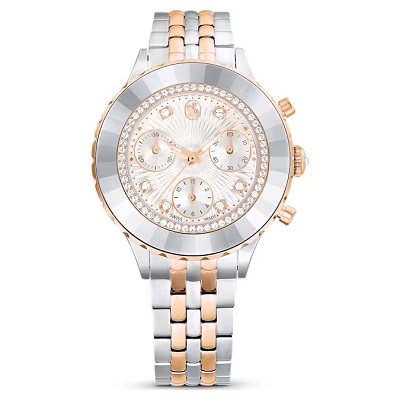 This dazzling chronograph watch delivers a perfect fusion of watchmaking expertise and Swarovski savoir-faire. The 37mm design is made with a mix of stainless steel and rose gold-tone finishing, and features a crystallized bezel, which is neatly faceted and accompanied by a circle of clear pavé. Beneath the mineral glass, the white guilloché dial features a swan logo at 12 o’clock, LumiNova coated hands, and three chronograph counters for separate measurements of hours, minutes, and seconds. There are also six clear crystals used for the indexes and a single crystal placed in the watch’s crown. This Swiss made watch is water resistant to 50m and is worn on a quick release bicolor bracelet.