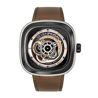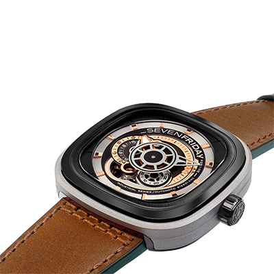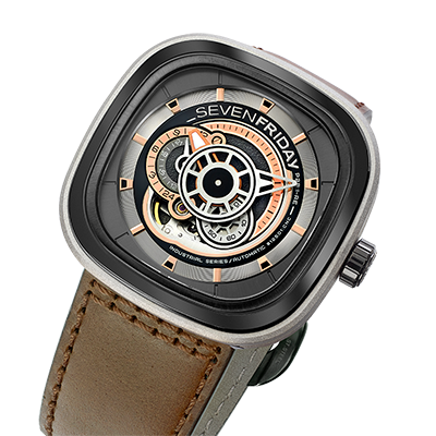 The P2B/01 reprises the industrial revolution inspired P-Series and the now infamous rounded square box. The multi level rose gold interface is encased in stainless steel with a polished dark grey PVD case. Sandblasted gun metal PVD animation ring and sun ray PVD bezel complete the P2B/01's new interpretation of vintage steam machines.