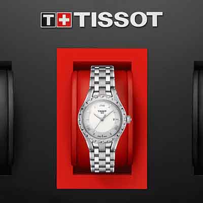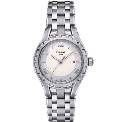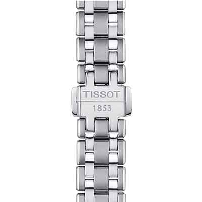 Stainless steel case with a stainless steel bracelet. Fixed stainless steel bezel. Silver dial with luminous silver-tone hands and index hour markers. Roman numerals appear at the 4, 8 and 12 o'clock position. Dial Type: Analog. Date display at the 3 o'clock position. ETA caliber F03.111 quartz movement. Scratch resistant sapphire crystal. Push / pull crown. Solid case back. Round case shape. Case size: 28 mm. Case thickness: 8.25 mm. Band width: 10 mm. Band length: 6.75 inches. Deployment clasp. Water resistant at 50 meters / 165 feet.